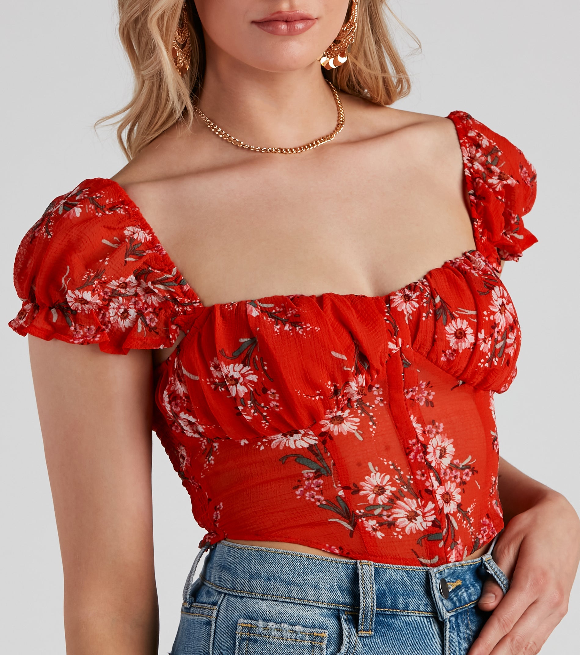 It’s full bloom ahead! Create a sweet look in this chiffon floral corset top featuring adorable puff sleeves. a ruched sweetheart neck. hook-eye front closures. and a cropped hem. Complete the look in denim