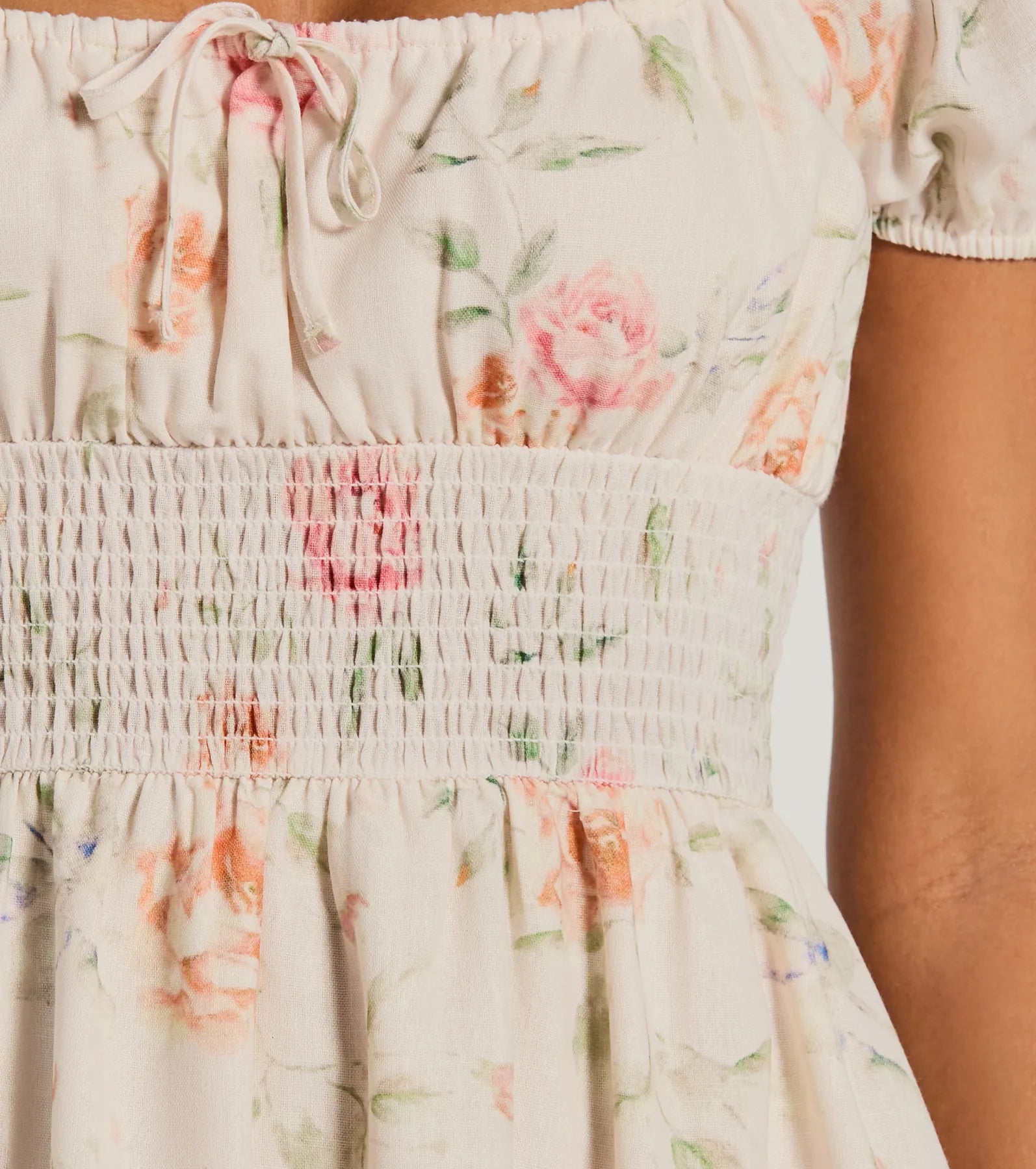 You’ll love wearing this sweet floral puff-sleeve skater dress all summer long! The lightweight woven fabric is detailed with a soft floral print for a pretty feminine look. The short dress features a scoop neckline with ruching and a tie-front accent. short puff sleeves with elastic cinched hems. a stretchy smocked high waist. and an adorable fit-and-flare silhouette with a ruffled hem for a flirty vibe. Style with for a cute and casual outfit.