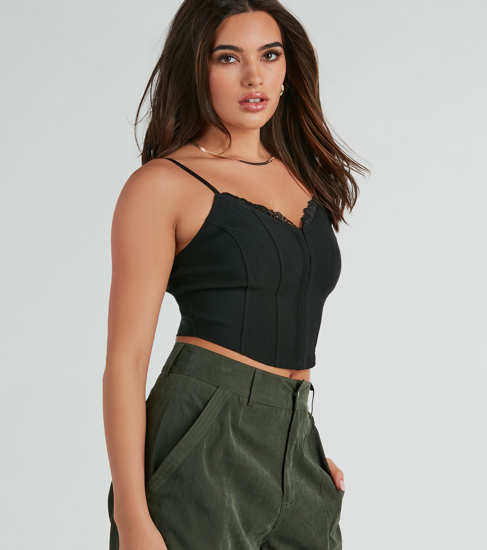 Turn heads in this sweet woven corset top for a stunning vibe with your favorite bottoms on casual dates or hangs with the girls! Crafted from smooth woven fabric. this corset crop top brings the flirt factor with a lace trim V-neckline. adjustable spaghetti straps. and hidden front hook and eye fasteners so you can get the perfect fit. Complete the look in . mules. and a purse.