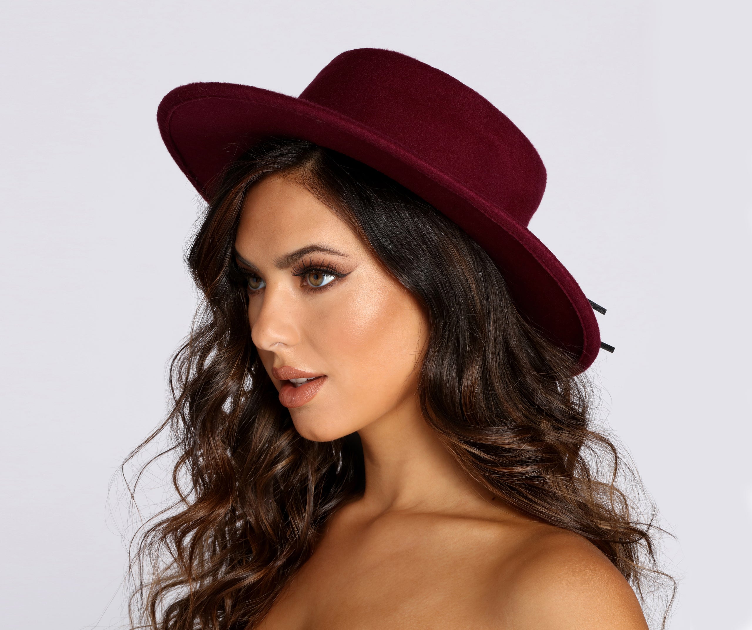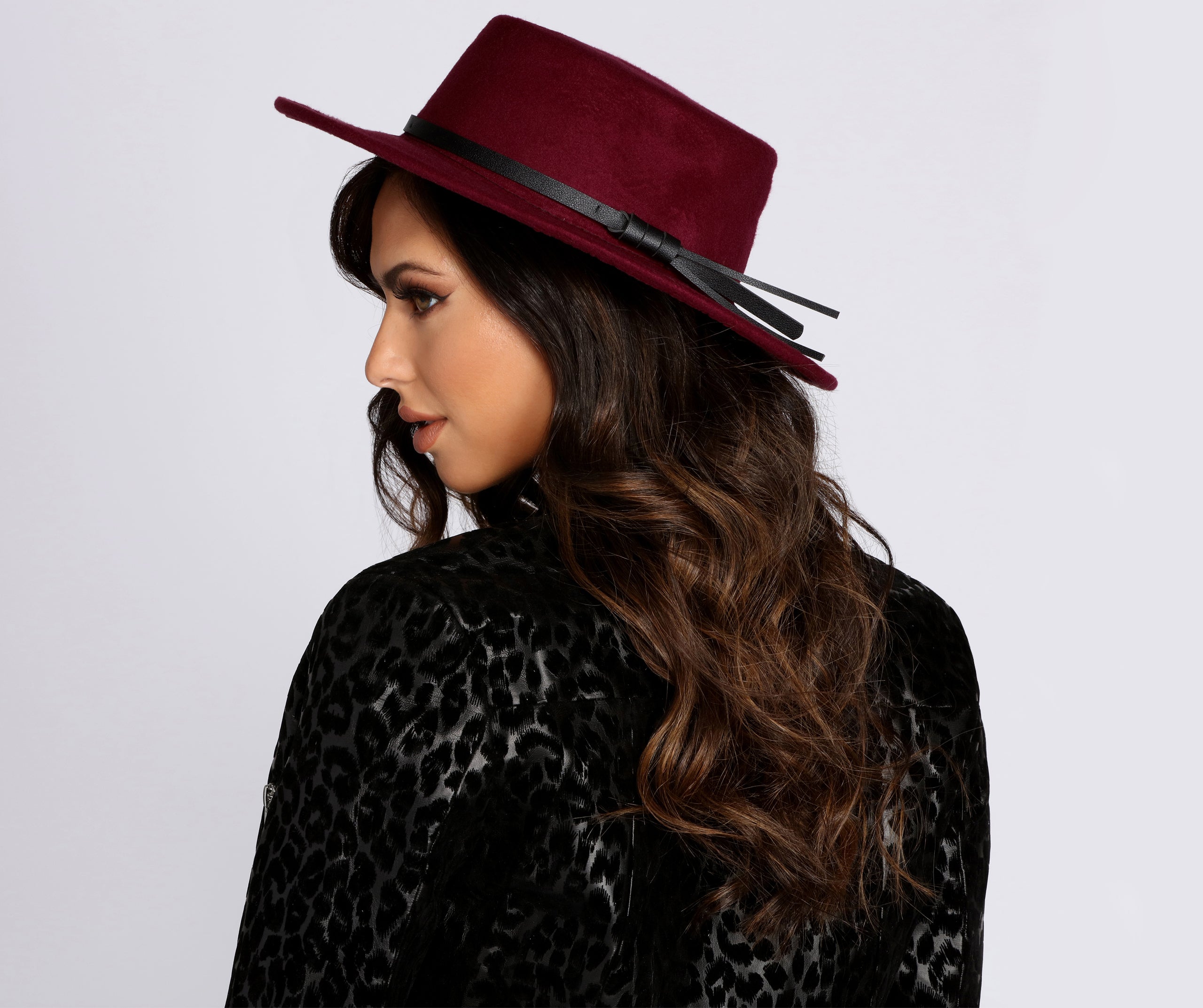 Complete your ensemble with chic boater hat! This must have boater is designed with a straight brim and a structured cap. and a faux leather band to create a bow. Hat is composed of a faux wool-like material.