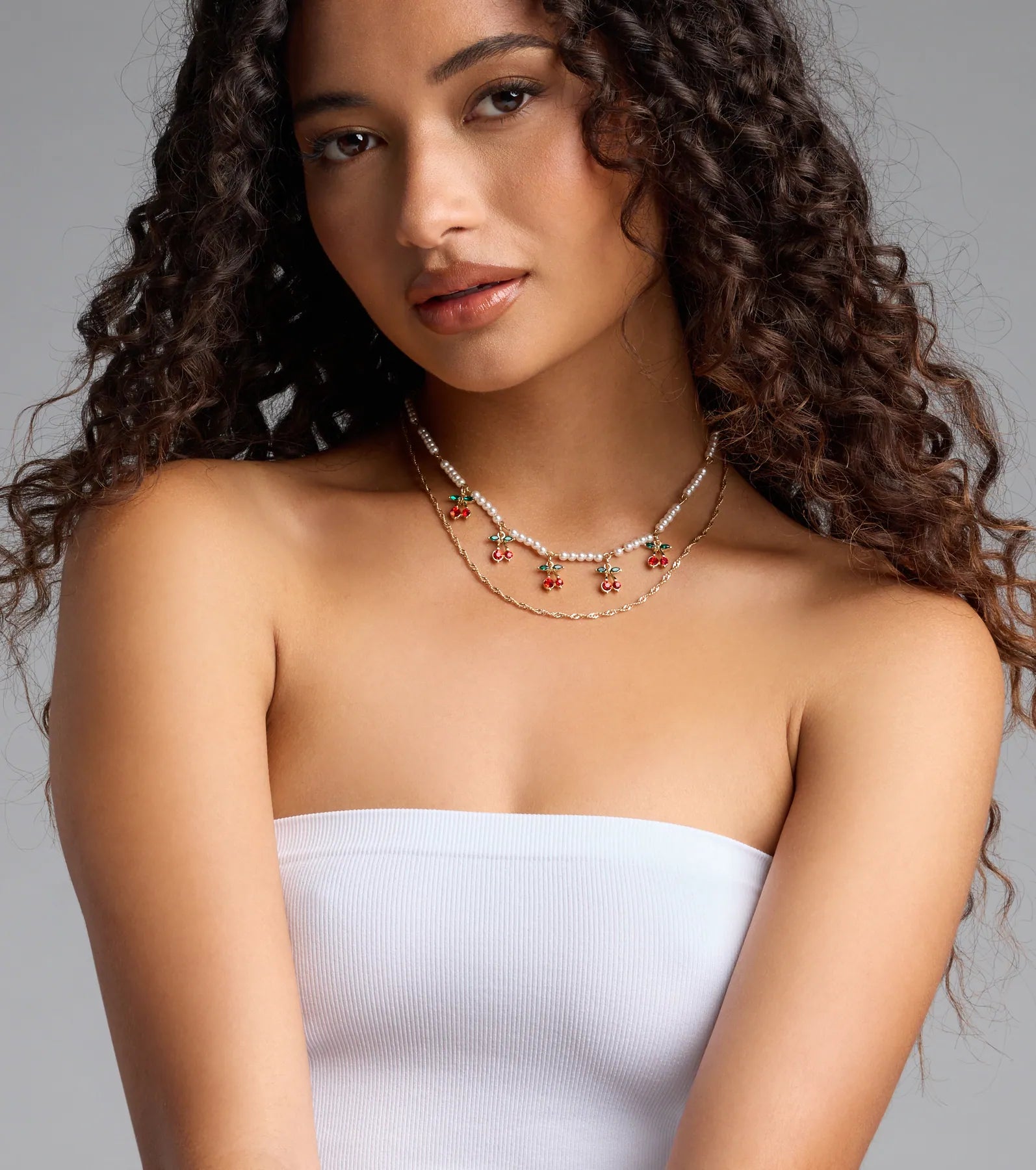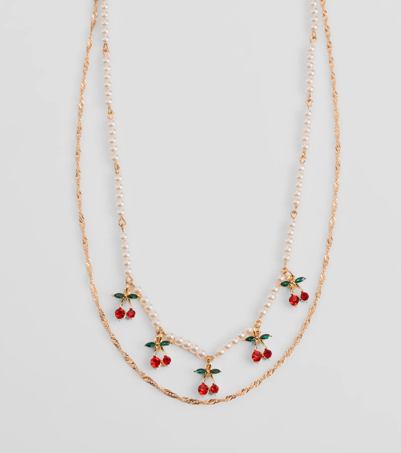 Sweeten up the vibe in this layered necklace with adorable colored rhinestone cherry charms and a luxe strand of faux pearls. Pair with a purse.