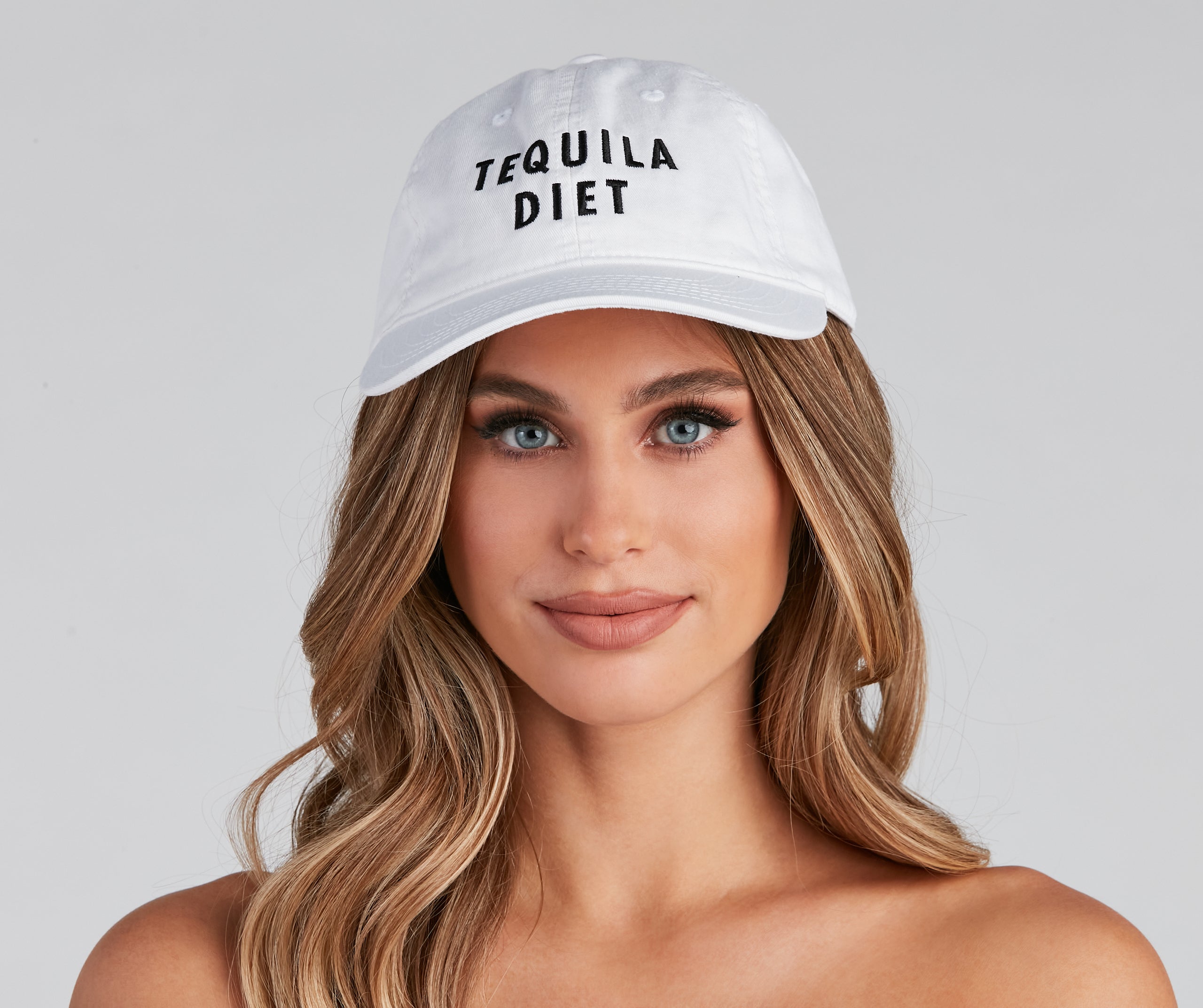 Let this cap say it all. babe! The sassy cap features a traditional baseball design and a contrasting script that reads: Tequila Diet.?Complete look with a crew neck top and?.
