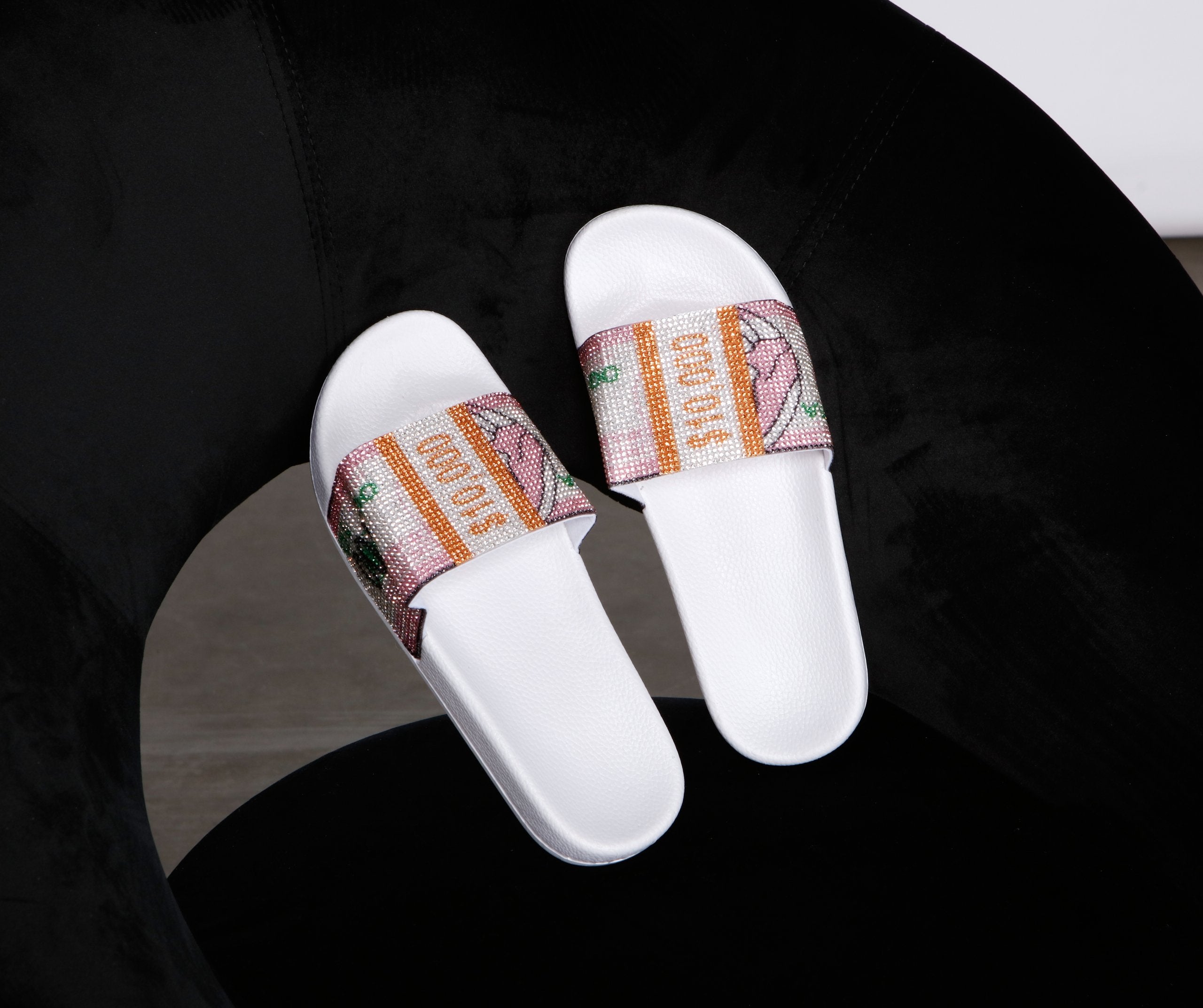 Live it up with slides that reveal your luxe side! The slides feature an easy slip-on design. an open almond toe. a wide rhinestone-embellished toe strap. a money bill design. and a flat footbed. Complete look with a .