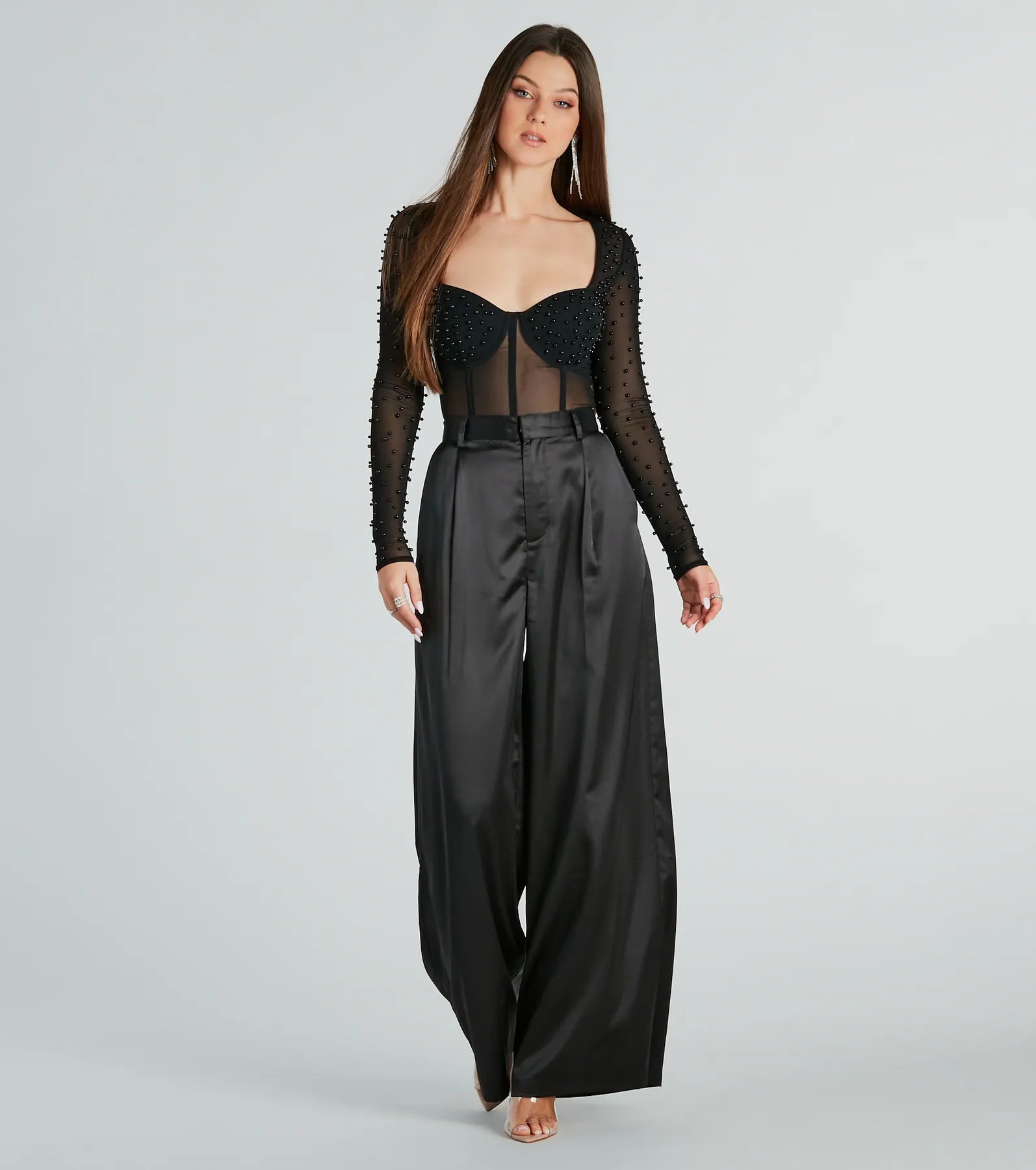 Look stunning in this ultra-pretty corset bodysuit! Sheer-fitted long sleeves and the sweetheart neckline with a built-in padded underwire bust are both adorned with faux pearls for a romantic and luxe finish while the sheer mesh bodice with flexible boning offers a snatched look. The bodysuit features a form-hugging fit. thong bottom. and snap-button closures. Style with sleek for a wine bar!
