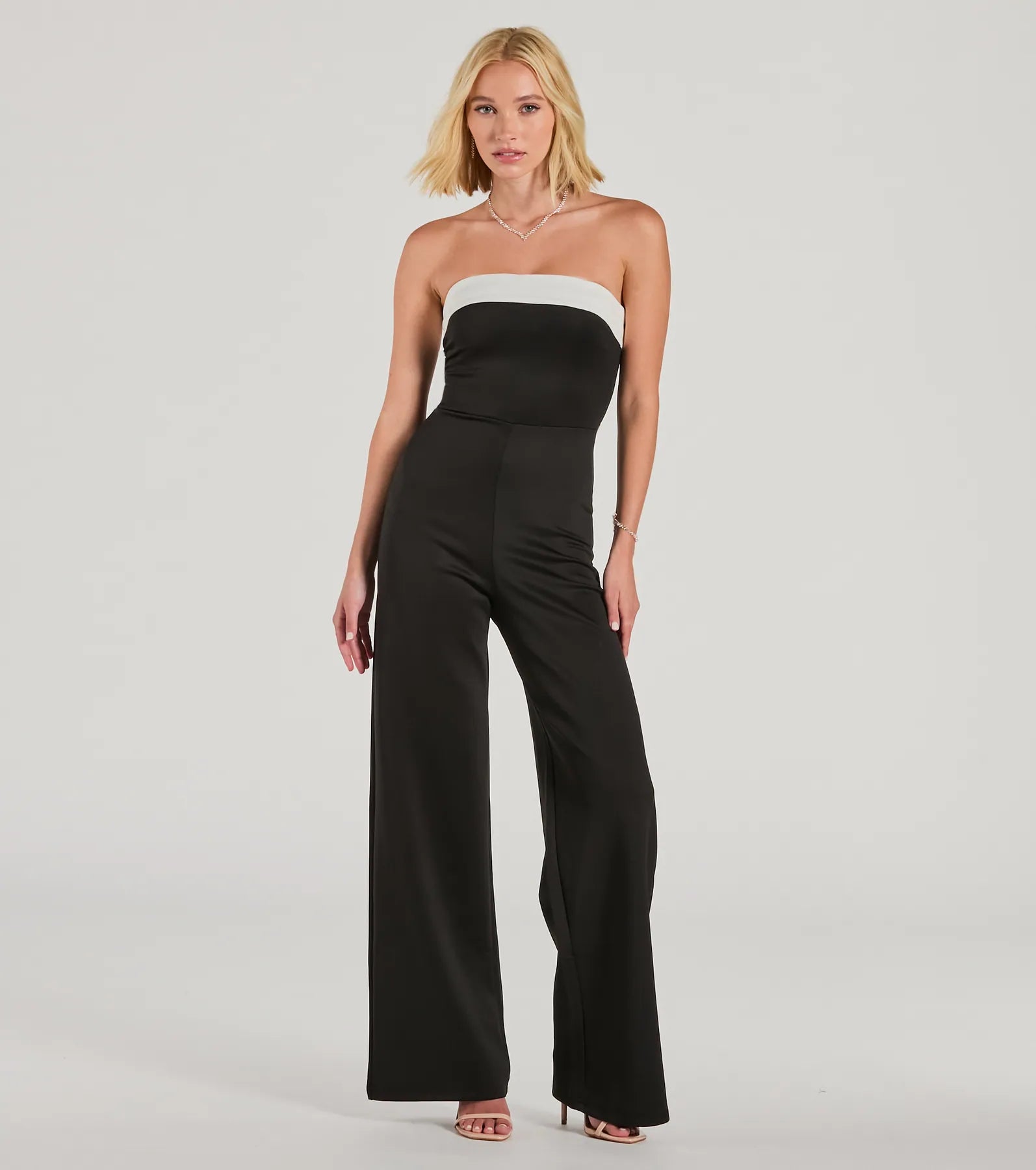 No one can hide their admiration for your chicness in this strapless jumpsuit perfect for cocktail hour! It features a chic contrast strapless neckline. a side zipper closure. and a flattering wide-leg silhouette on smooth knit fabric. Complete the look in .