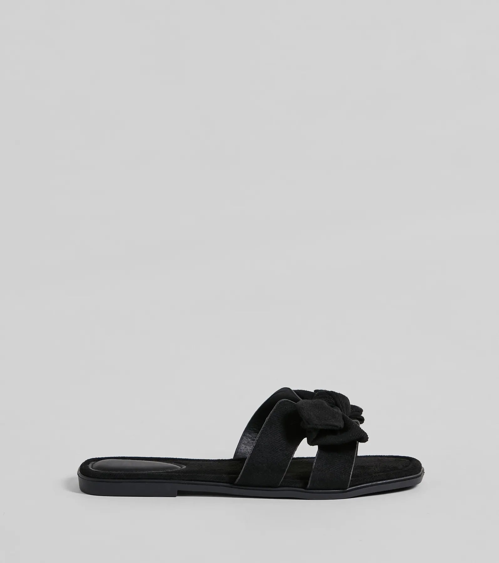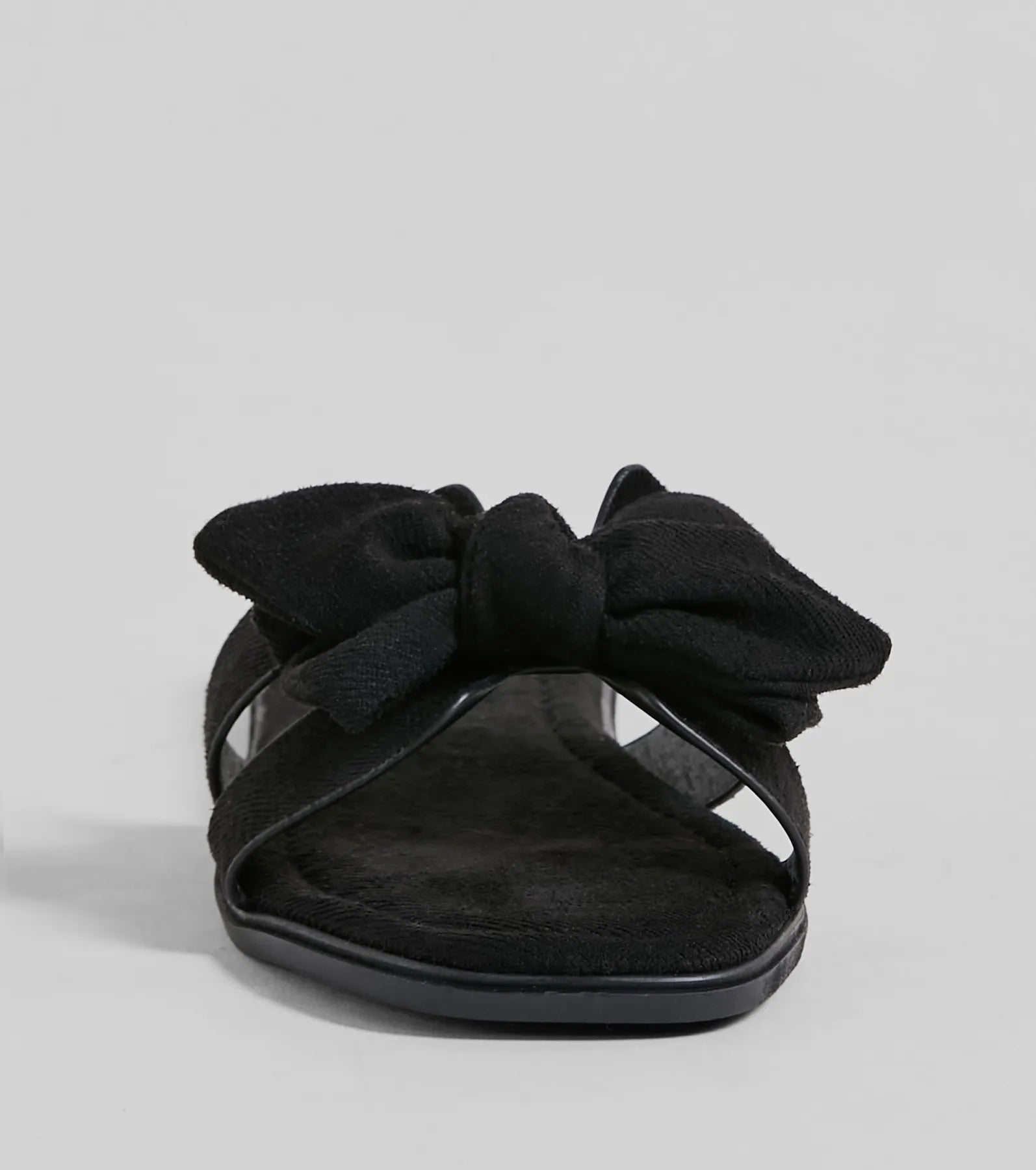 Tie your outfit together in these cute flat sandals showcasing a square toe. a cutout strap with a knot bow. and a comfortable insole. Complete the look with a trendy for any occasion!