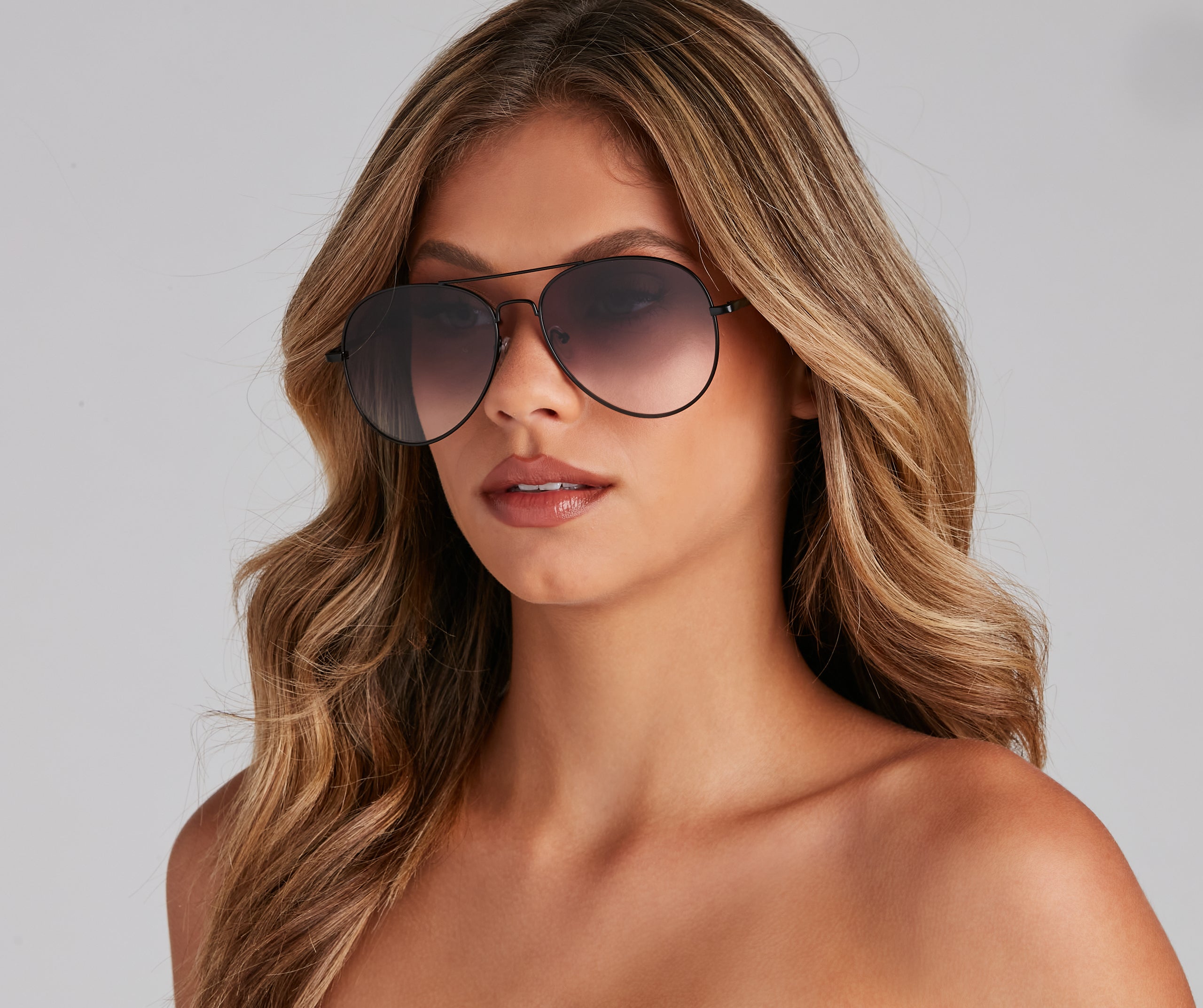 Be on top of the style game in these aviator sunglasses featuring a stylish ombre lens. metal trim. and sturdy arms. Complete the look in an edgy graphic