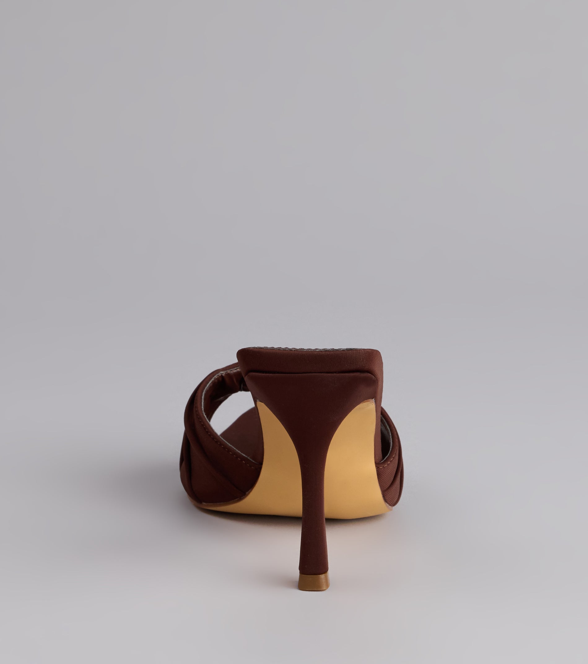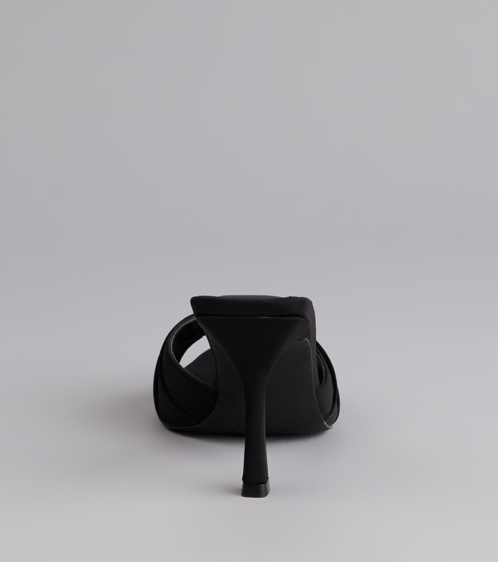 Sultry from heel to toe??these mules bring instant allure with their sleek stiletto shape and chic gold hardware. Perfect for nights when your outfit needs just the right touch of drama.
