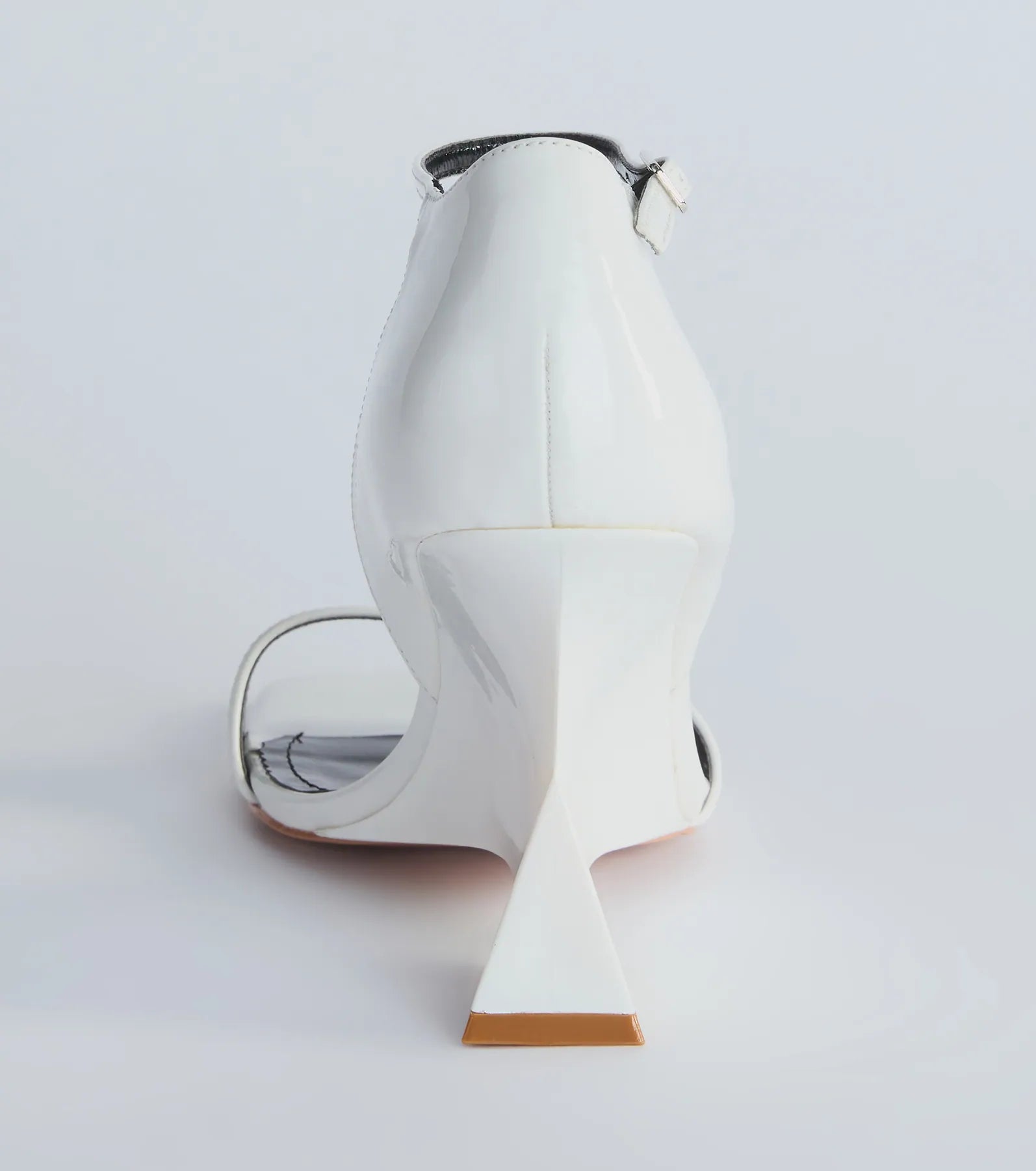 Radiate trendsetter energy and turn heads your next night out in these fabulous asymmetric wedge heels! Made with shiny patent faux leather. they feature an open square-shaped toe with a strap. a thin adjustable ankle strap with a buckle closure. a closed back. and an angled wedge heel. Style with a and rhinestone fringe earrings!