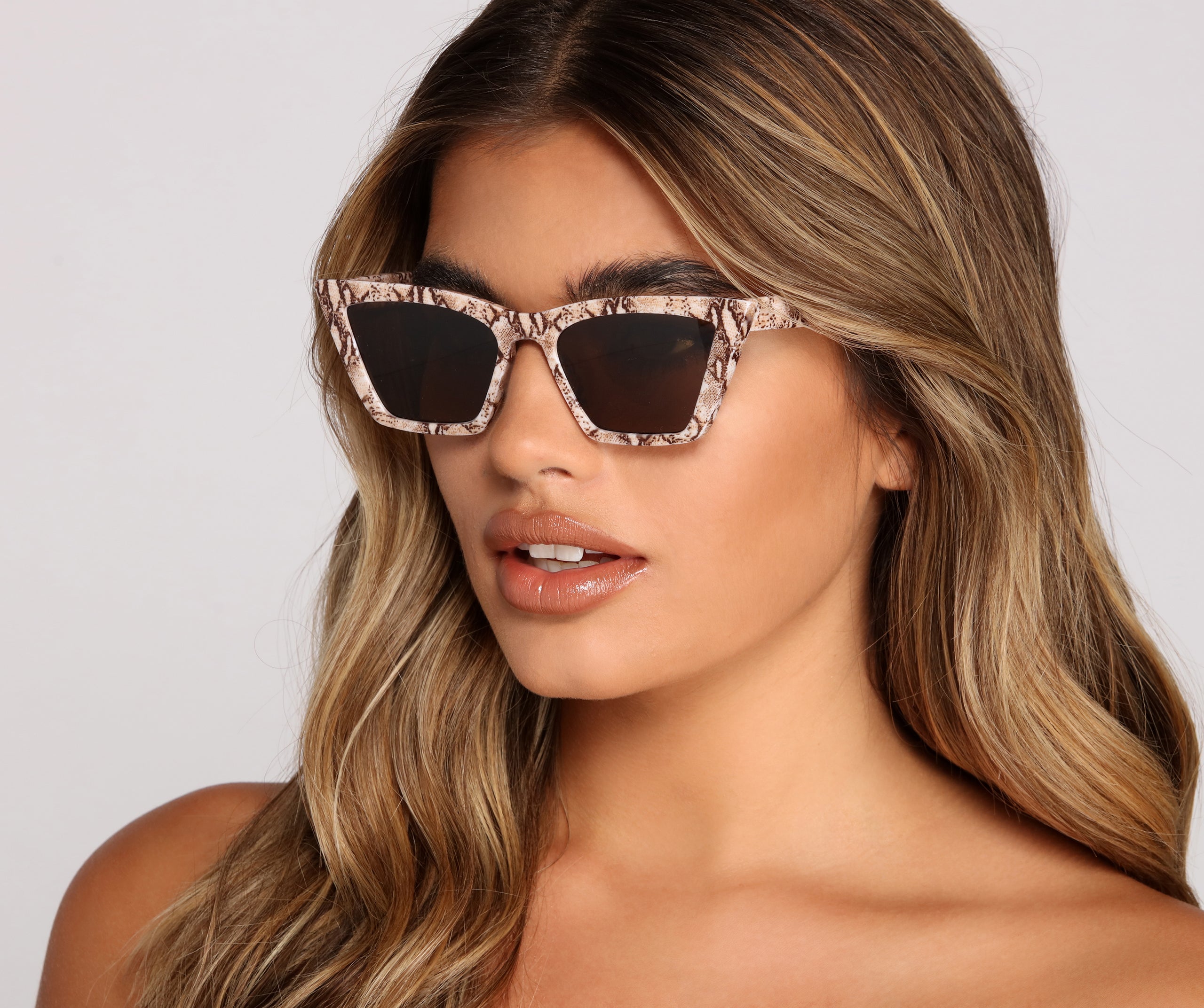 You’re a total trendsetting diva. and these stylish sunglasses were made for you! They feature a chic cat-eye shape. a plastic frame with an all-over snake print design. and tinted lenses. Complete the look with a .