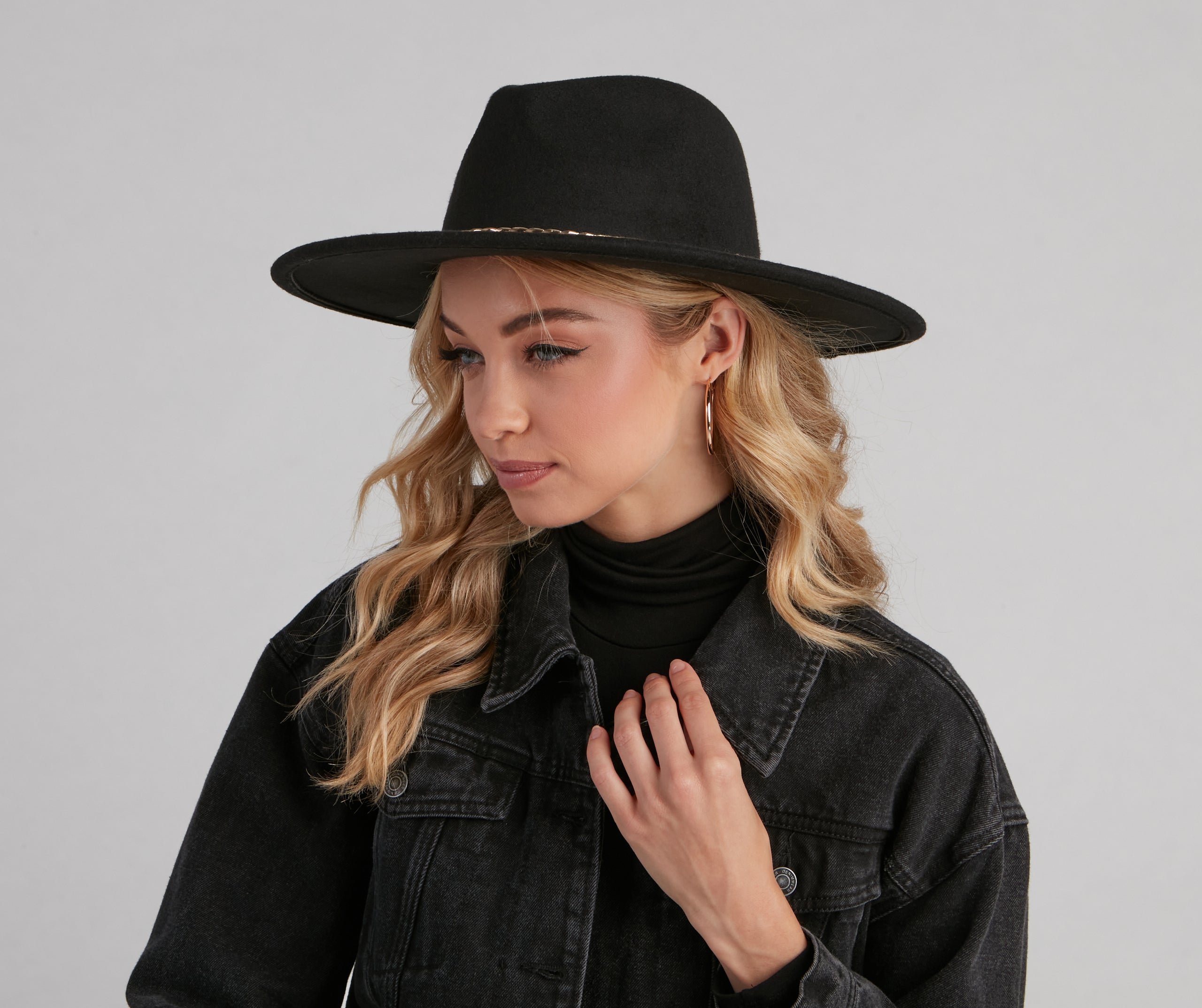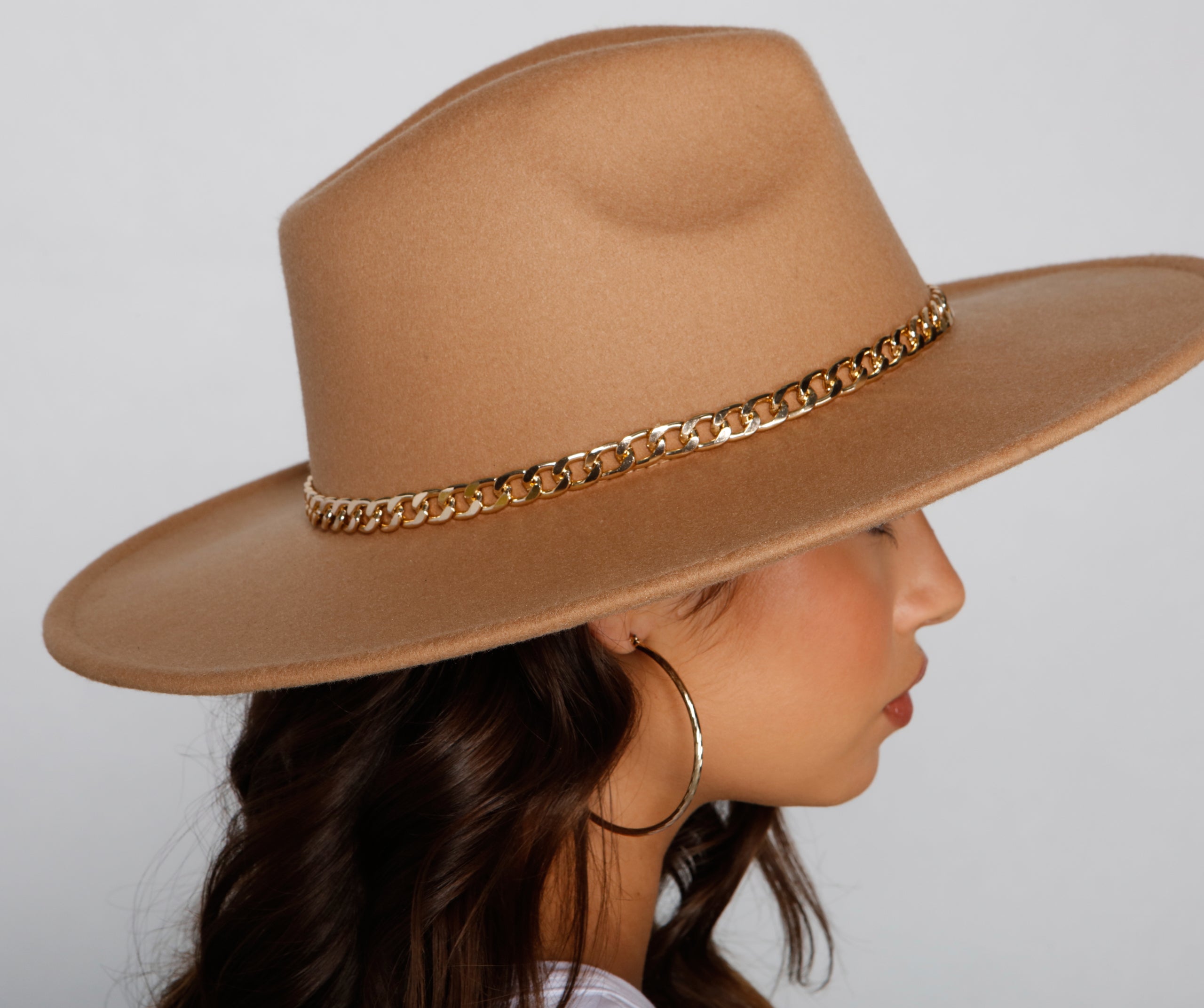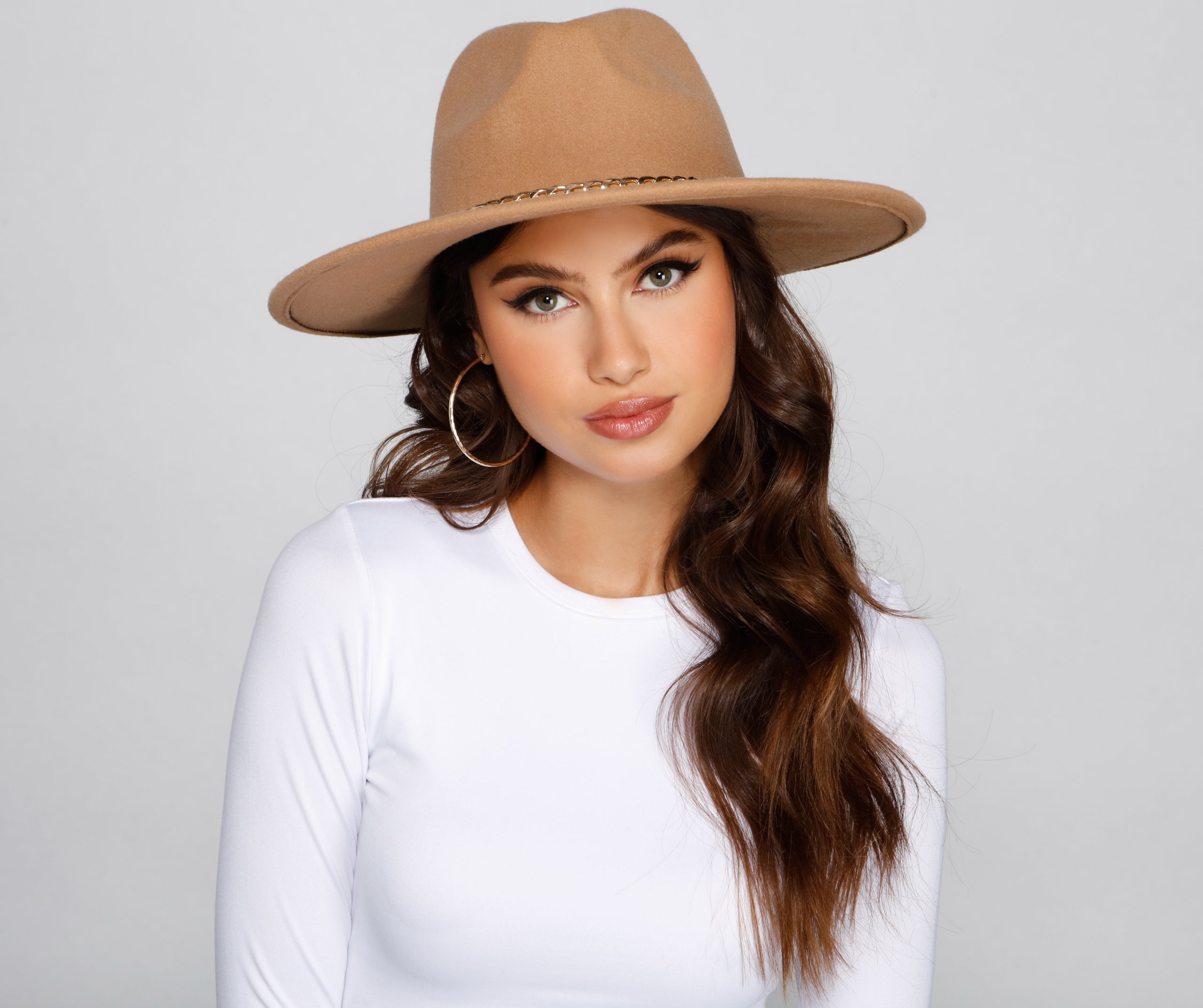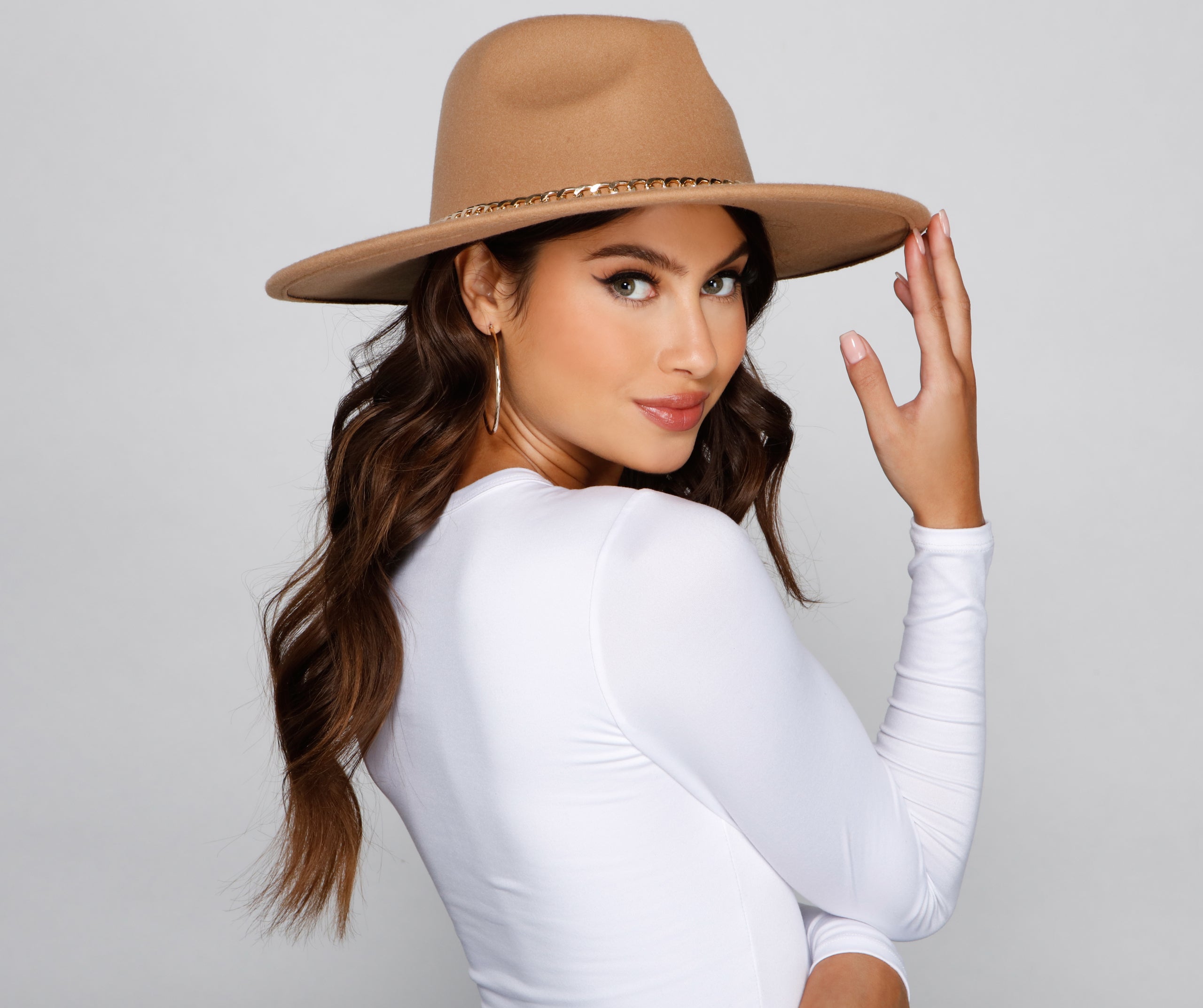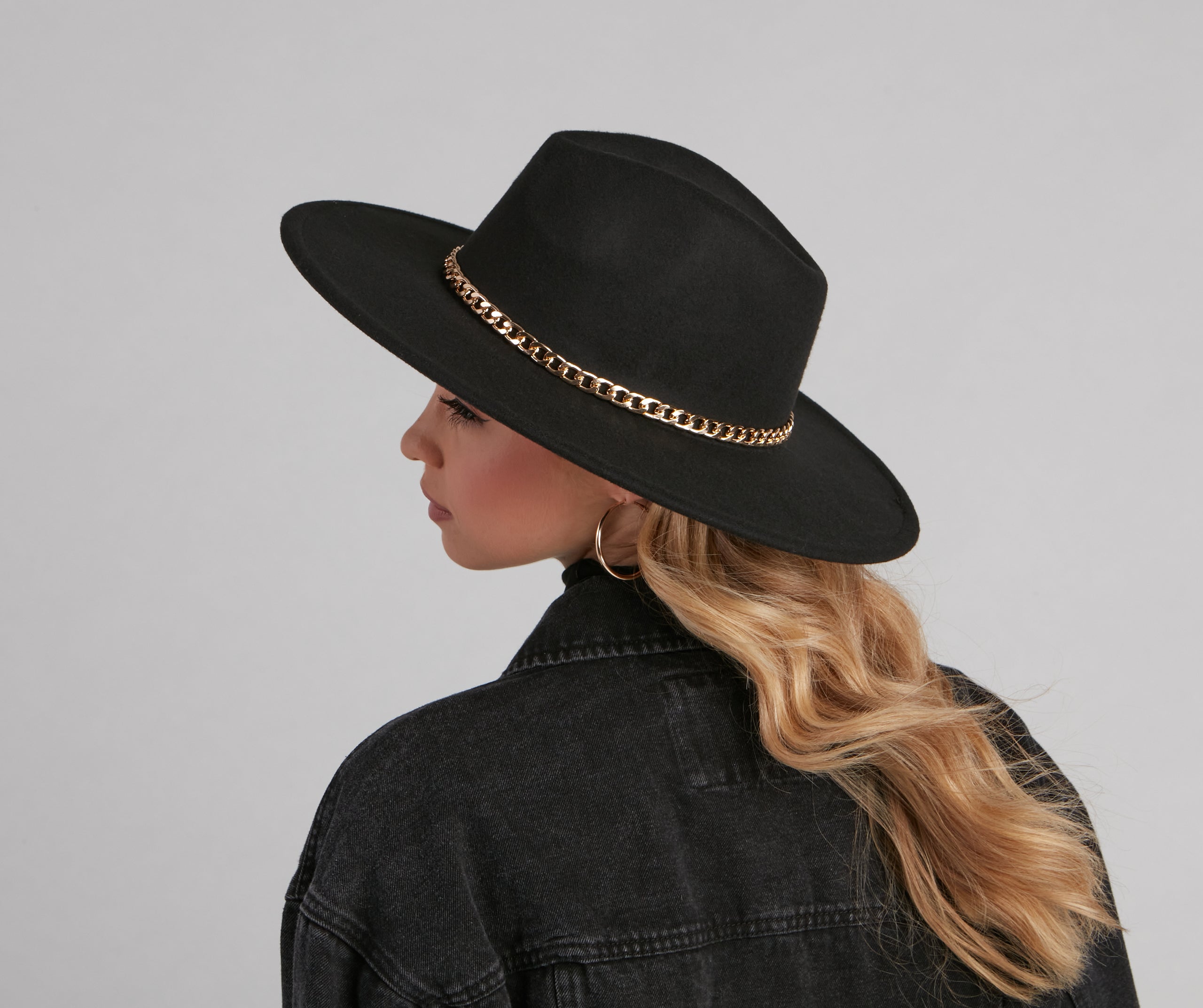 Bring the trendy glam vibes to your everyday look with this faux wool Panama hat. It features a wide flat brim with a center chunky chain-link accent trim. Pair this hat with .