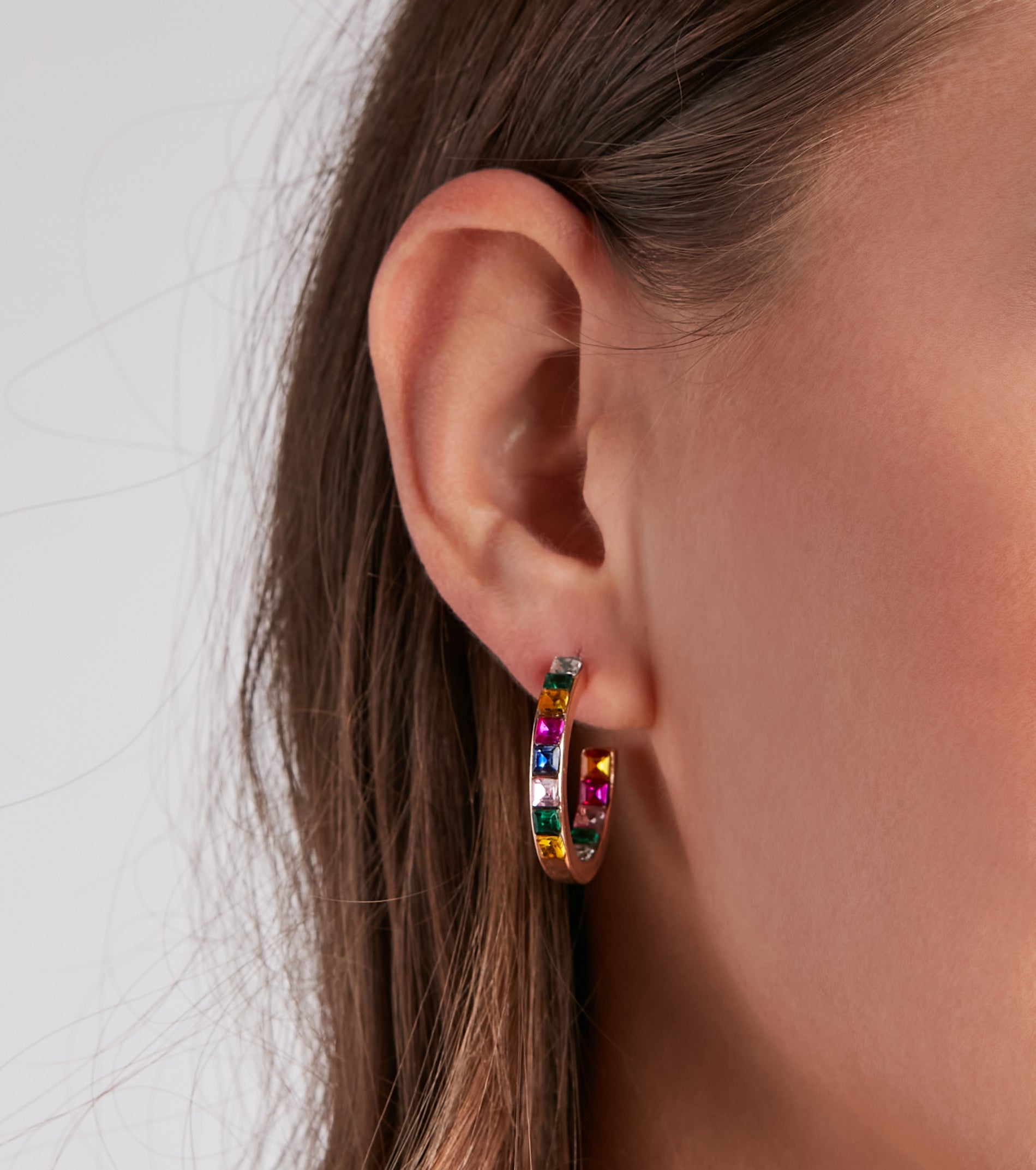 This gorgeous gemstone earrings set brings the trendy luxe vibes to your look! The multipack features three different earrings including linear duster earrings with a single row of multi-colored gemstones. small hoops with multi-colored gemstones. and small wide huggie earrings. Style this set with a .