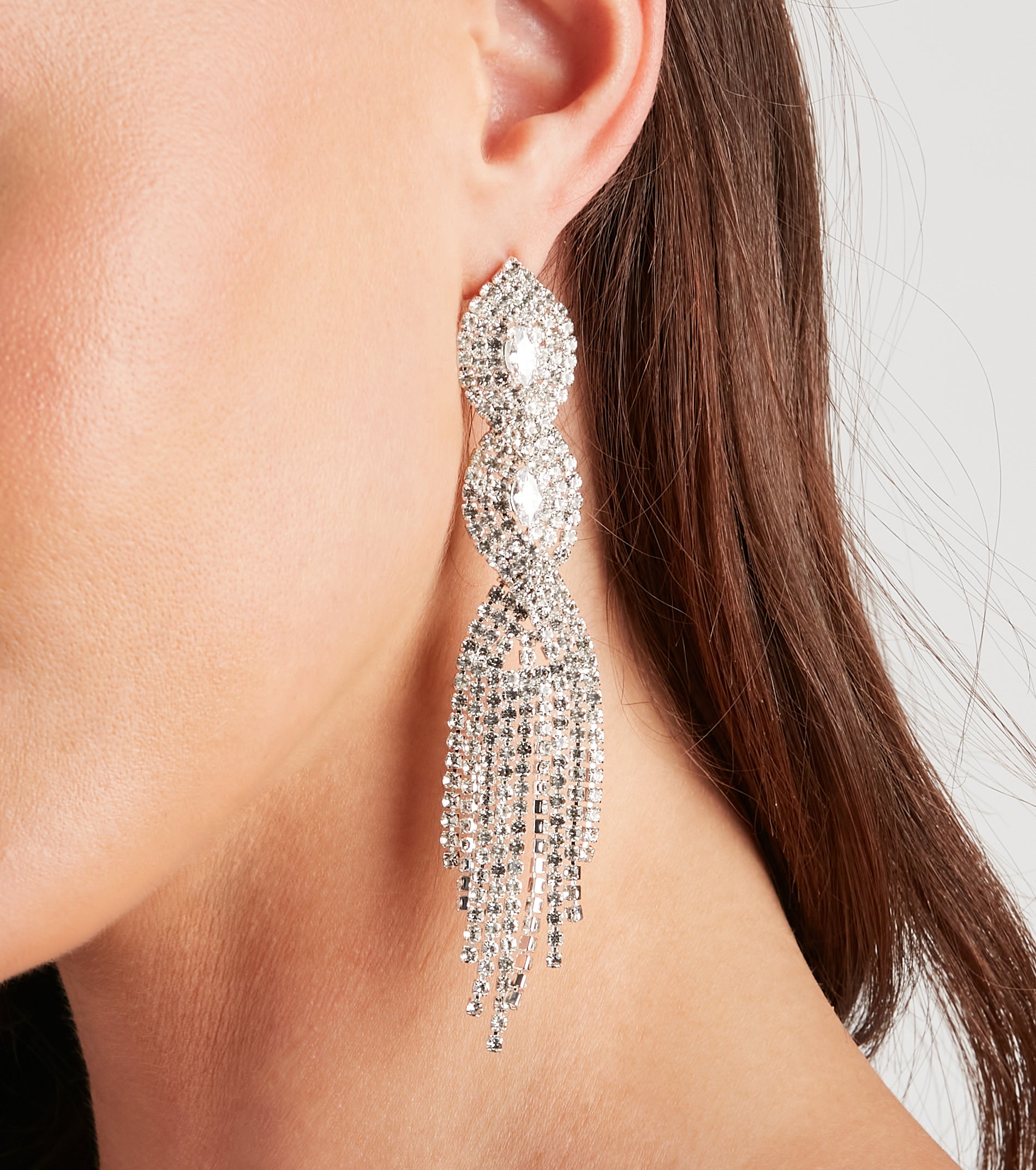 These twist rhinestone earrings are the perfect compliment to your formal wear! They feature a statement design with fringe and a post-back closure. Style with a chic for a dressy occasion!
