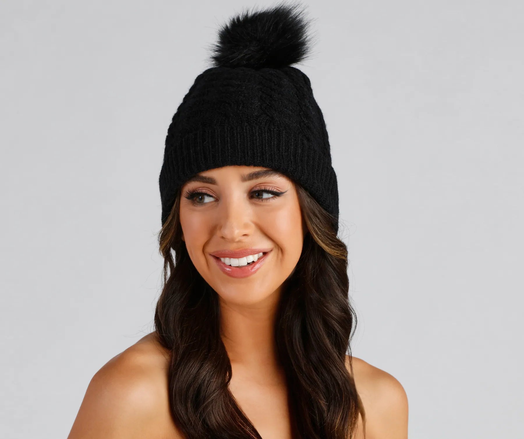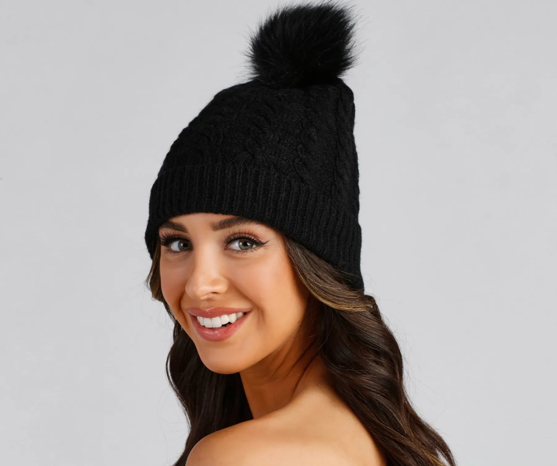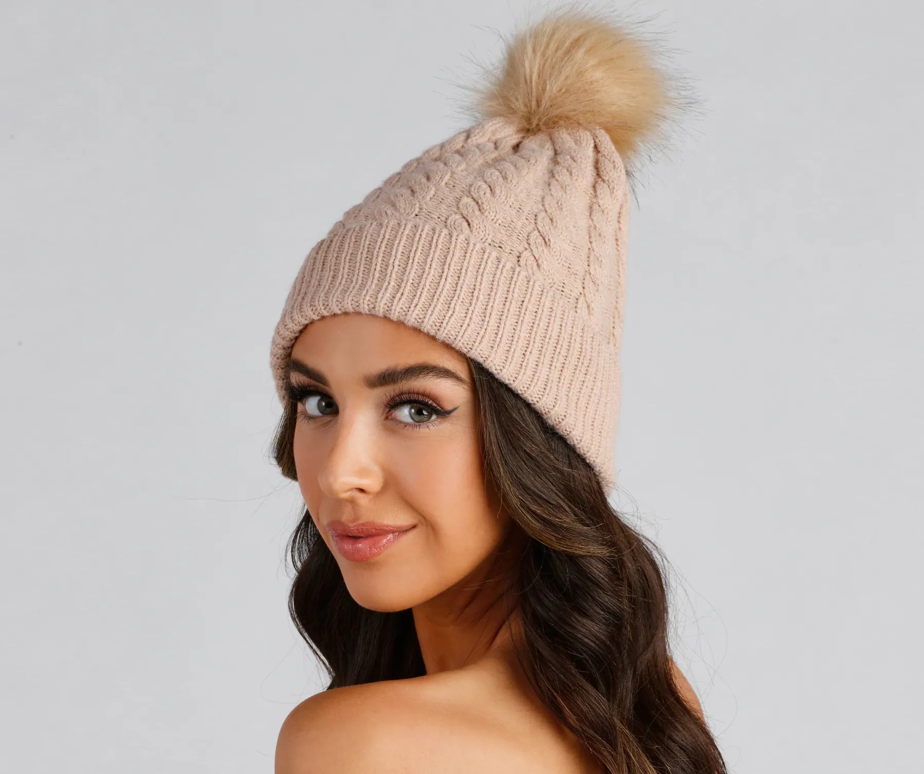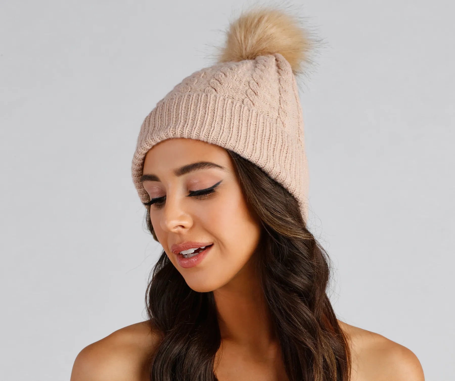 Keep warm. toasty. and cute in this cable knit beanie featuring a tonal faux fur pom. Complete your cold-weather fit withand boots.