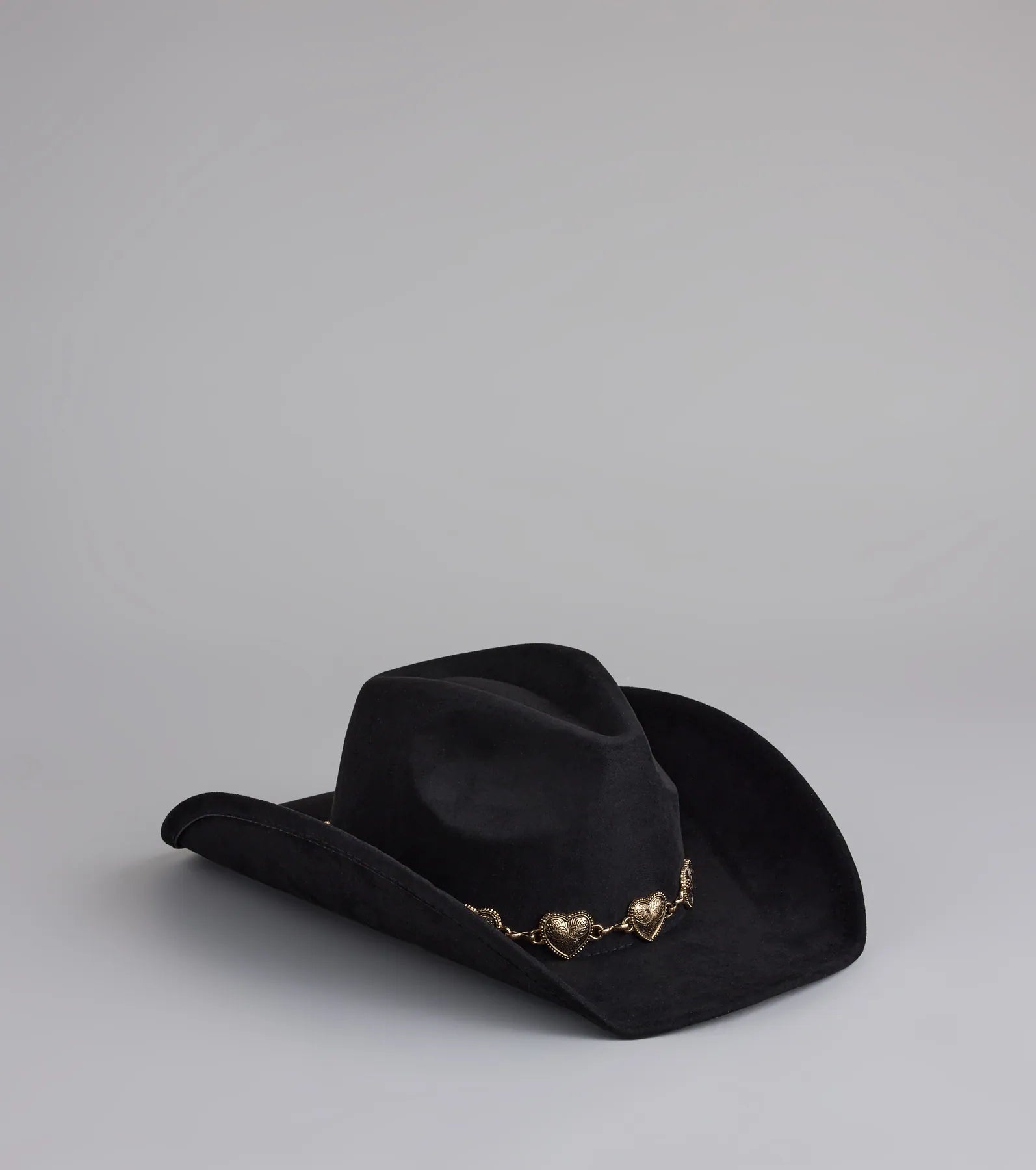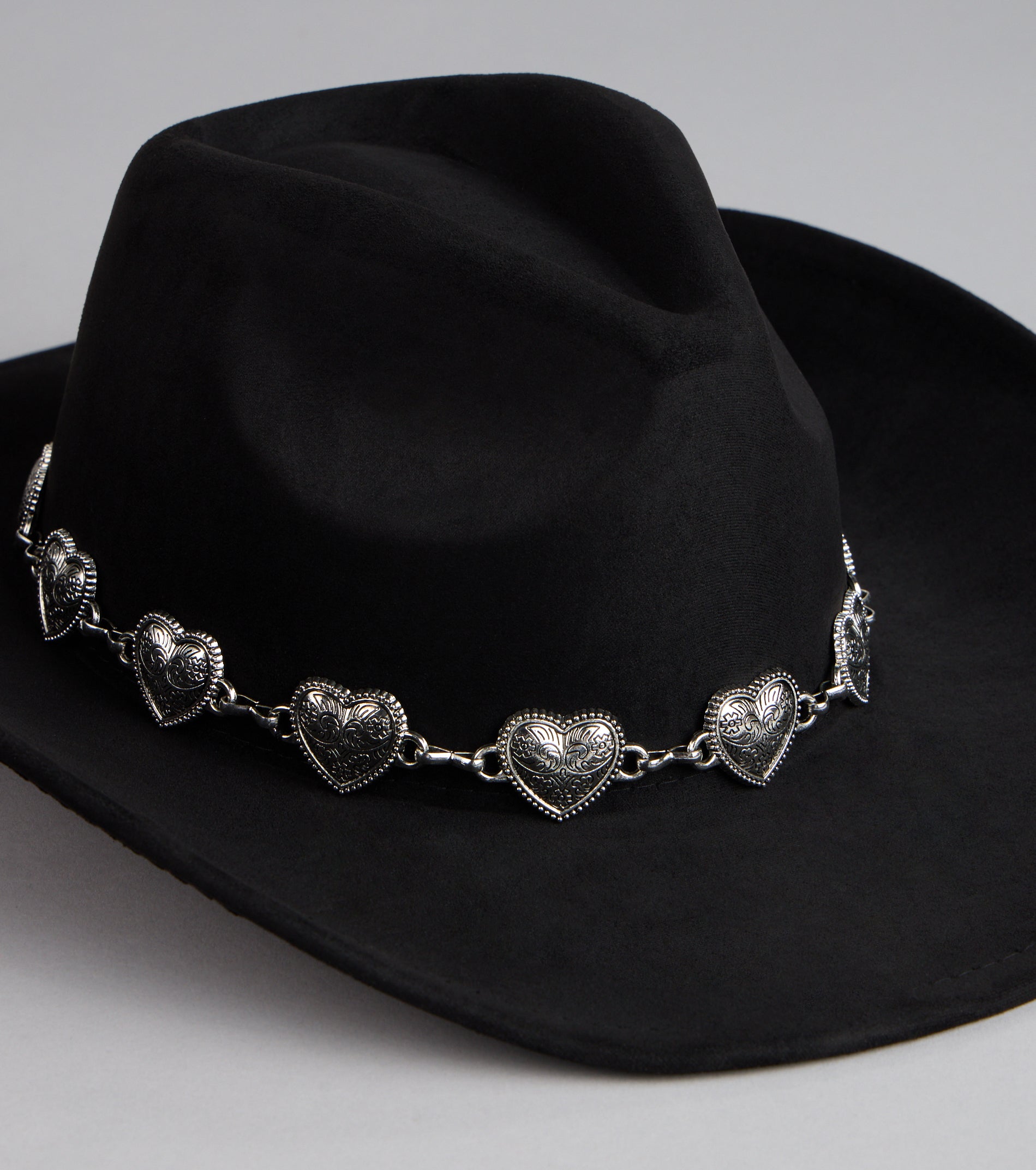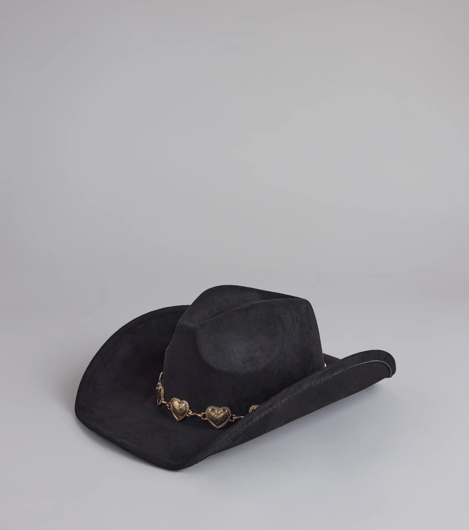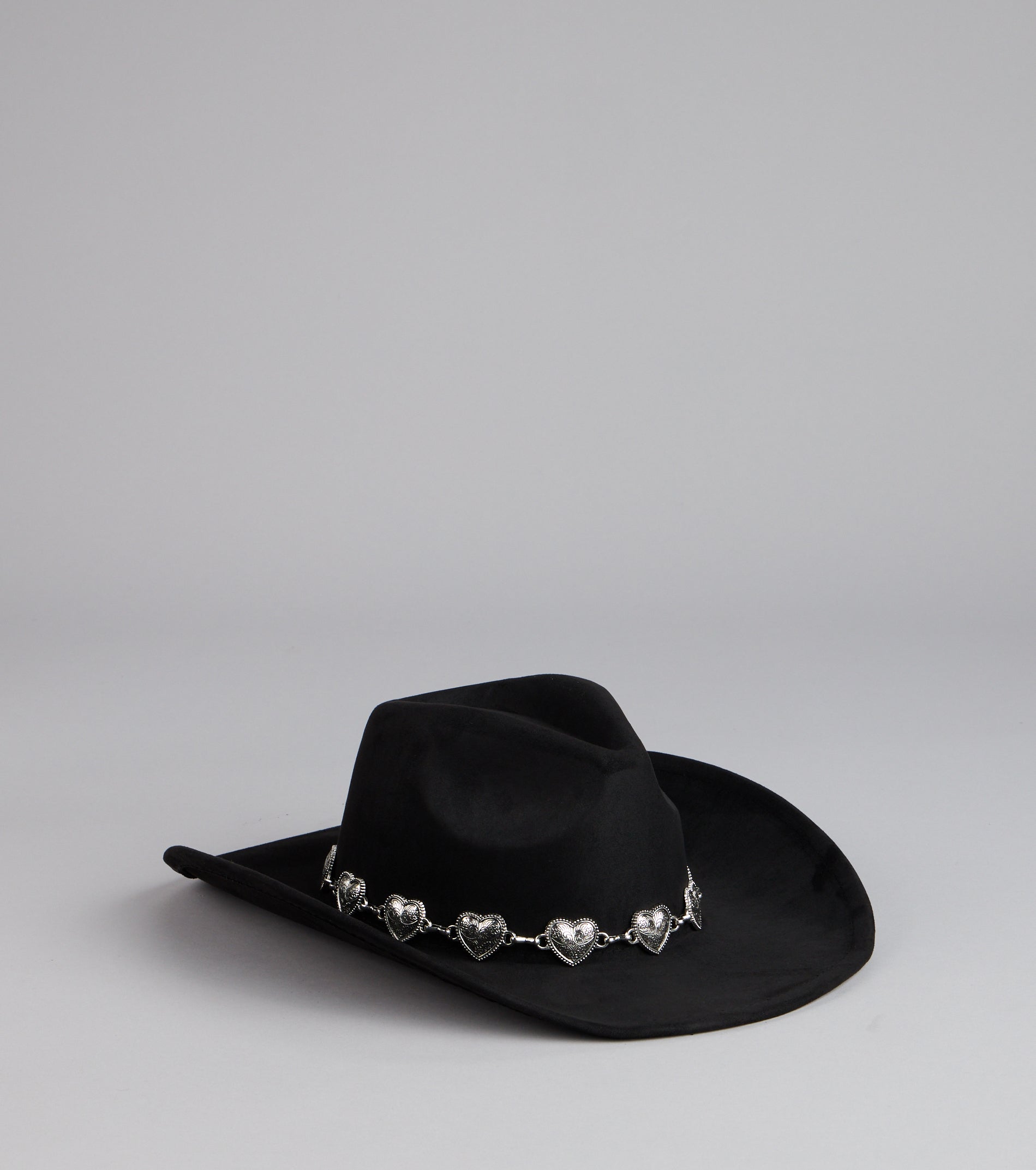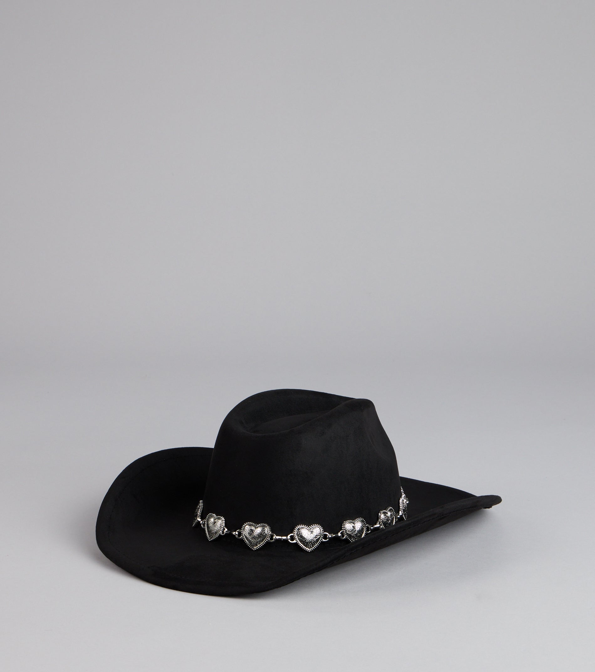 Look like a total western babe with this faux suede cowboy hat featuring a heart concho chain-link trim for a chic accent. Style for festivals. concerts. parties. and getting the perf shot for the gram.