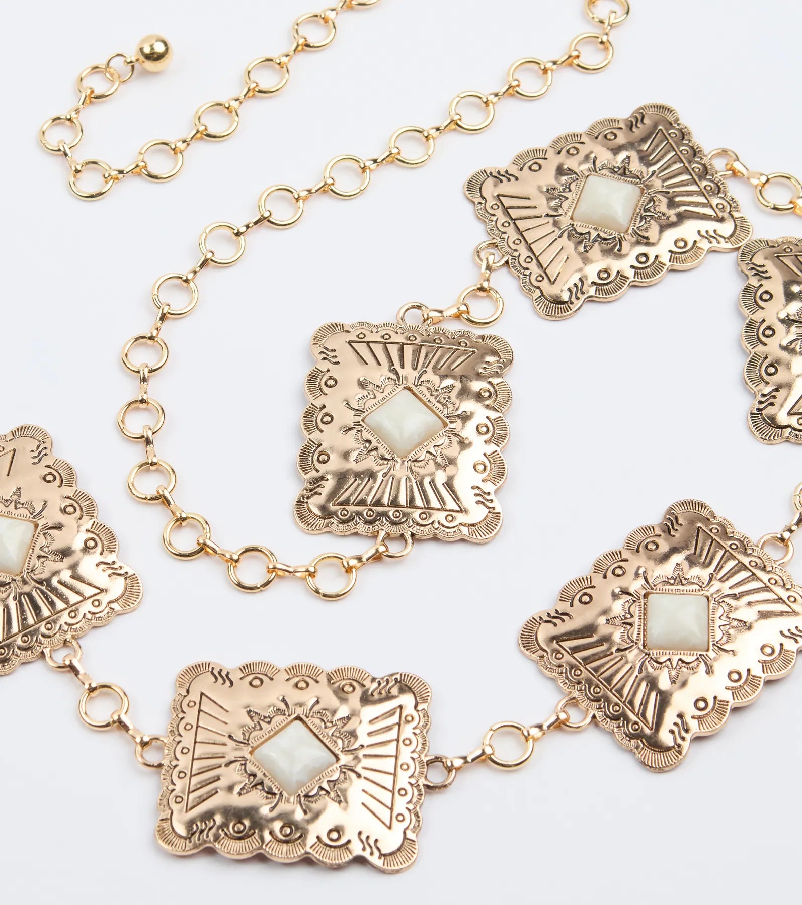 This western-inspired chain belt features large square shapes with colored stones and is secured with a lobster clasp closure. Perfect for cinching any outfit together.