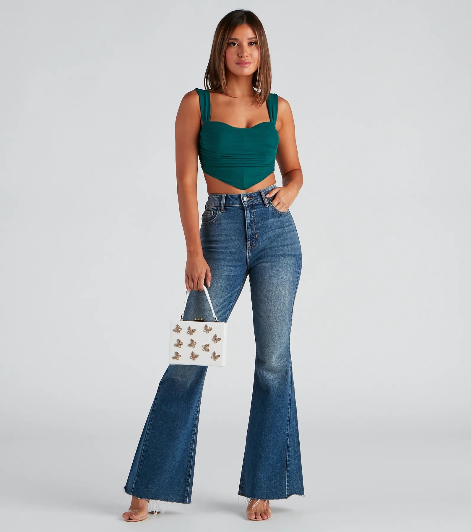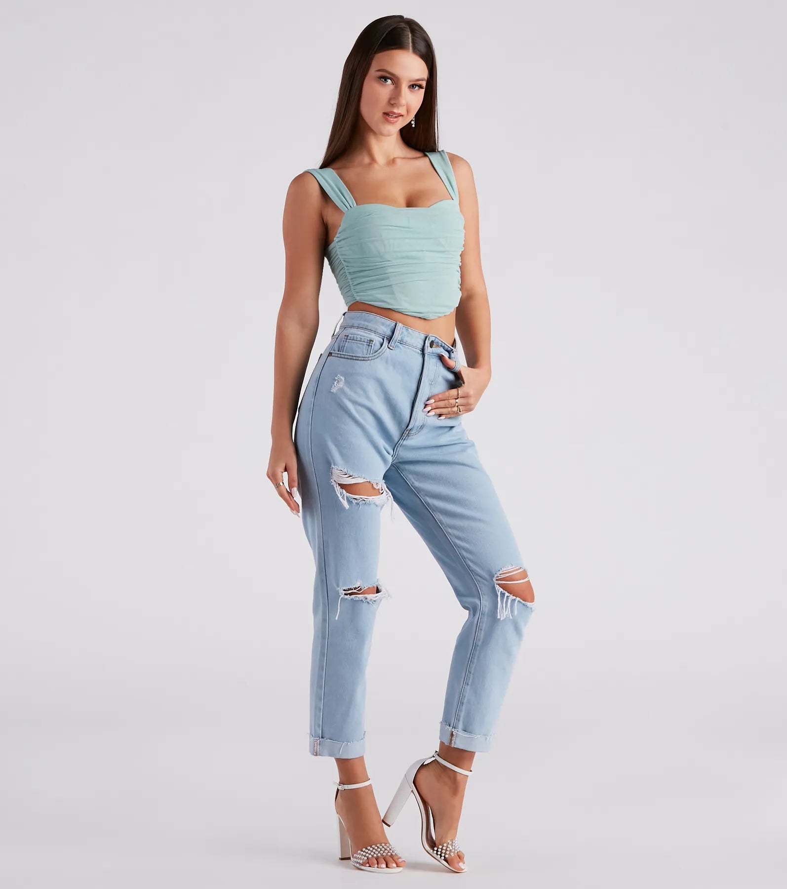 Stun like the It Girl you are with a bustier that brings the drama! The bustier features a sleeveless sweetheart neckline with underwire cups. a draped accent across the bodice. tank shoulder straps. side ruched seams. and a cropped hem. The top is composed of a lined mesh fabric that offers a form-hugging fit with minimal stretch. Complete look with a .