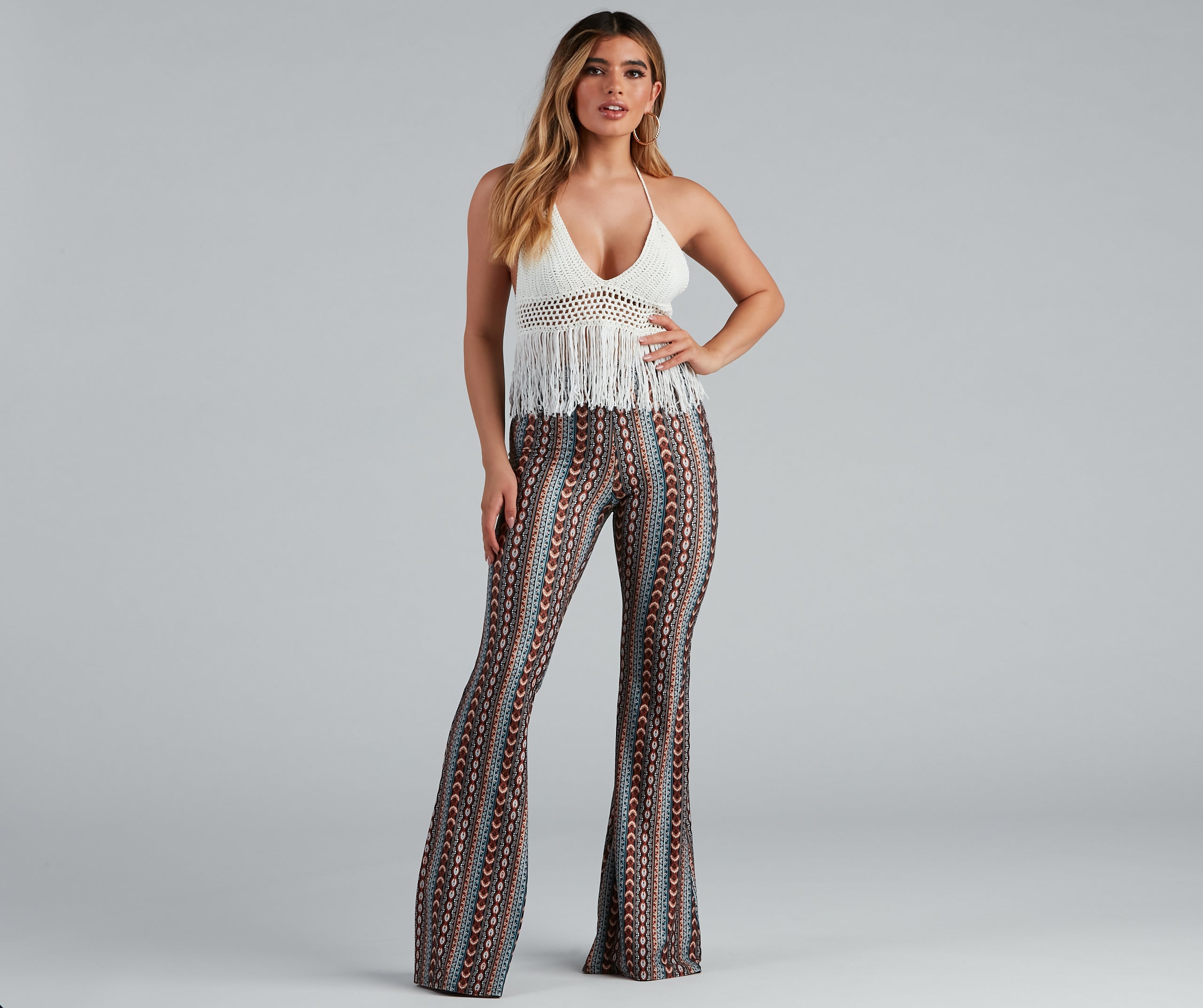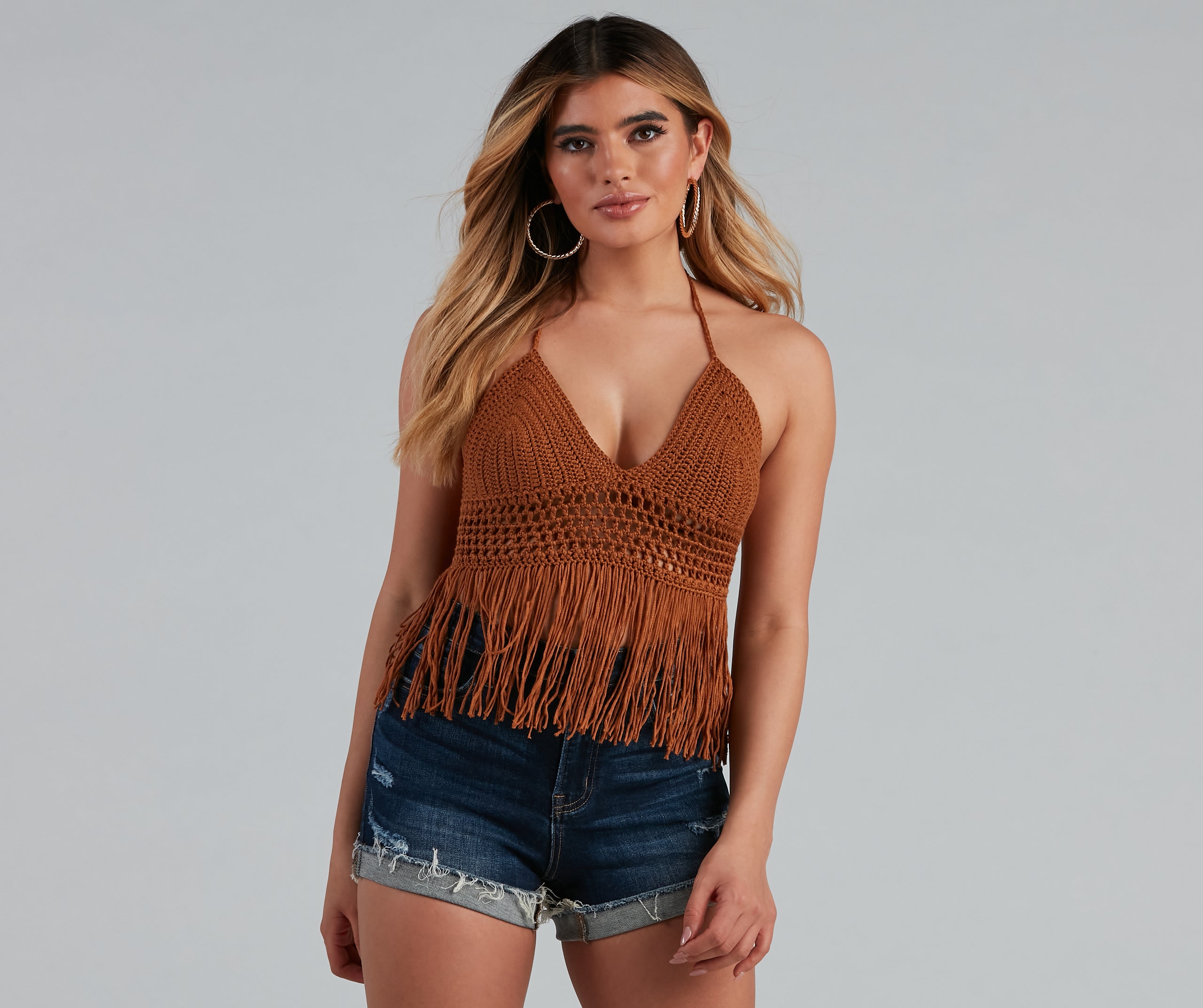 Channel your bohemian side with a crochet top that will have you ready for festival season! The top features a halter neck. neck ties to easily adjust. and a fringe hem. The top is composed of an unlined crochet knit fabric that offers a relaxed fit with minimal stretch. Complete look with .
